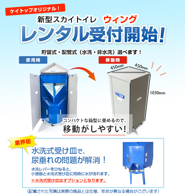 2017.07.10 スカイトイレ「ウィング」、レンタル開始! お知らせ ケイトップのオリジナル商品、スカイトイレ「ウィング」のレンタルがスタートしました! どうぞよろしくお願いいたします! レンタルのお問い合わせはこちら Prev 【※受付終了しました】狭小地専用トイレ期間限定レンタル開始! Next コインシャワー、レンタル開始! お知らせ一覧へ