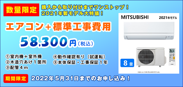 5月末までのエアコン本体+標準工事込のお得なセットになっております。